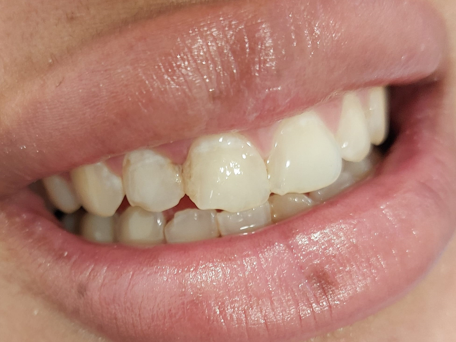 Ząb siekacz przebarwiony po leczeniu kanałowym, wykonano licówke kompozytową na jednej wizycie.